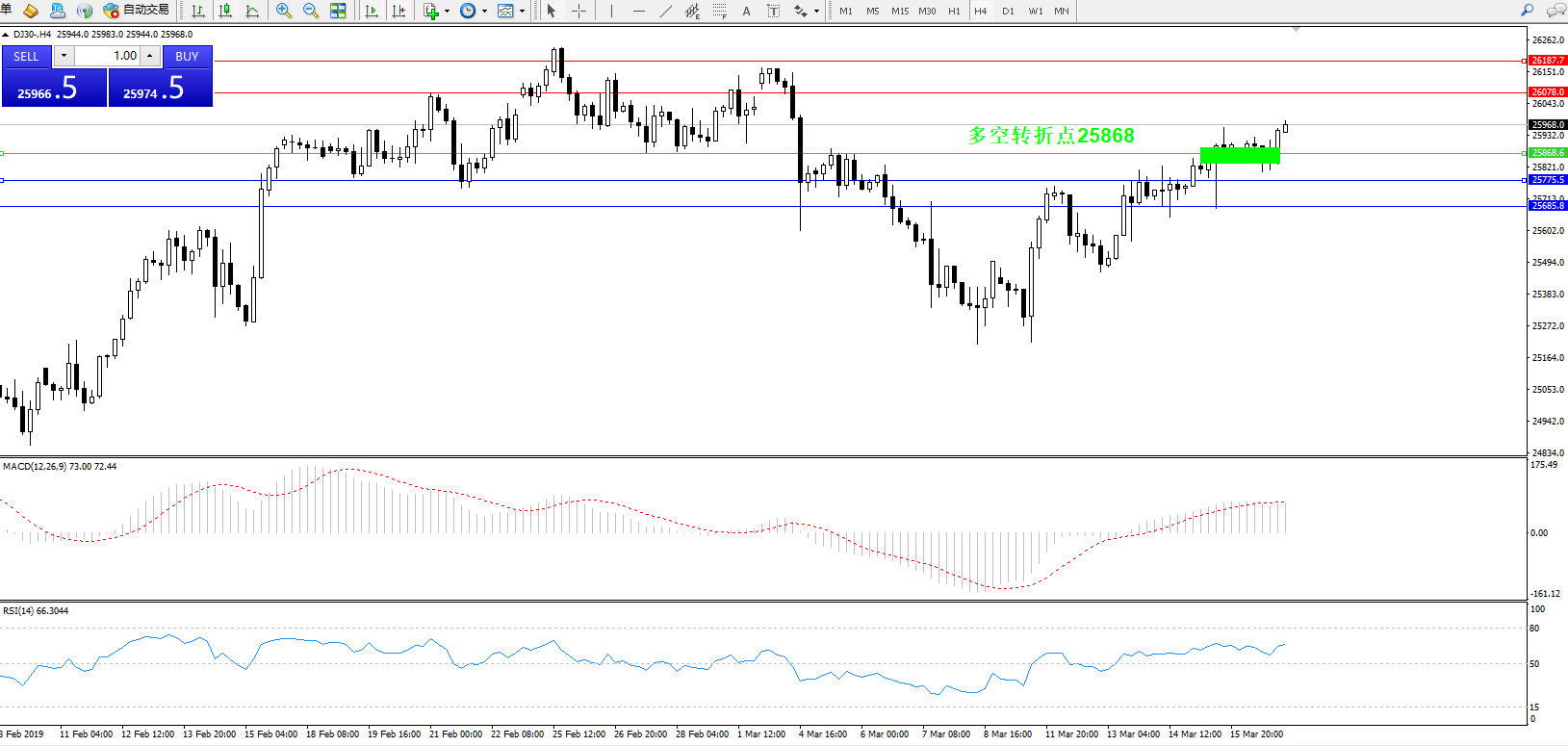 道琼斯指数周一盘上涨65.20点,涨幅0.25%,报25914.10点。道琼斯指数连续第四交易日收涨,银行股领涨,但波音和Facebook拖累股市。投资者关注美联储本周的会议,以确认其对“耐心”货币政策的承诺。石油和天然气、工业和金融等上涨的板块带领股指走高。据CME“美联储观察”:美联储今年3月维持利率在2.25%-2.5%区间的概率为98.7%,降息概率为1.3%;今年6月维持利率在该区间的概率为85.3%,降息25个基点和50个基点的概率分别为14.1%0.6%
