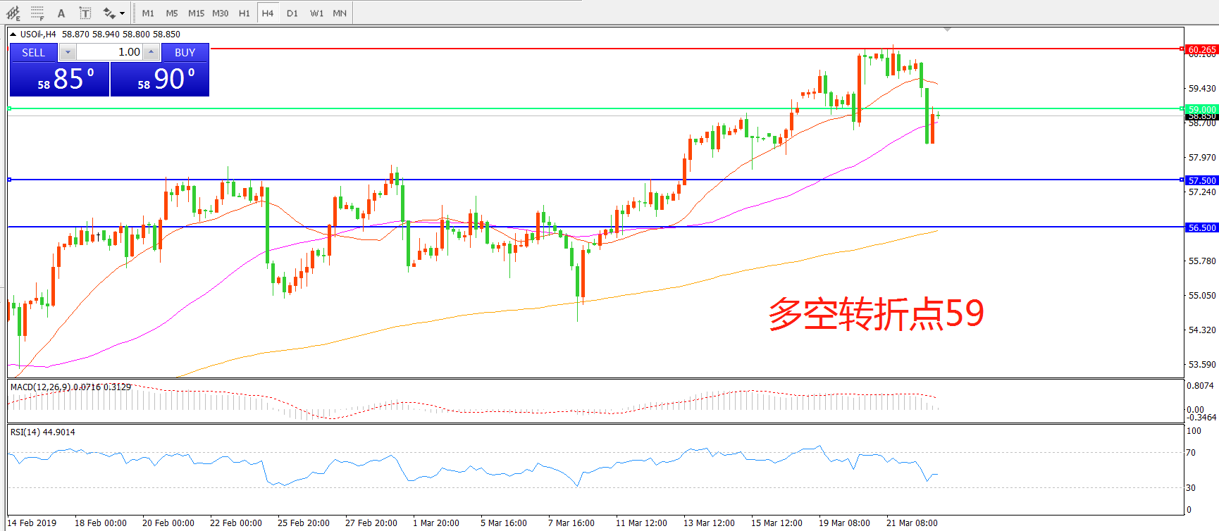 交易策略:在59.00   之下看跌,目标57.50     56.50