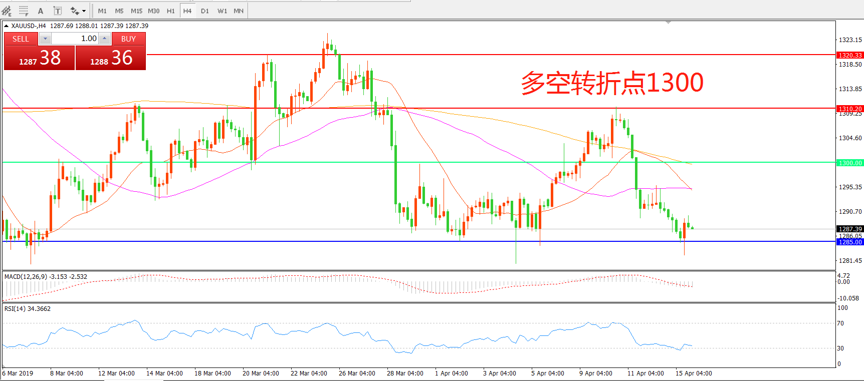 交易策略:在1300.00之下看跌,目标1285.00 1270.00