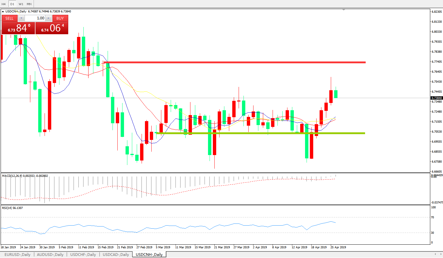 交易策略6.6990之上,看涨,目标价位为6.7845,然后为6.8185