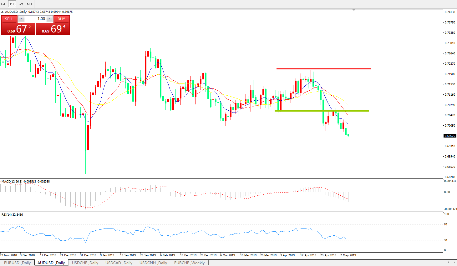 技术面简析:日图均线有序空头排列看跌,汇价多空转折区域下方反弹无力继续下行,MACD下穿0轴且动能柱0轴下方放量,RSI逐步走弱,预计汇价反弹整理后将进一步下行。