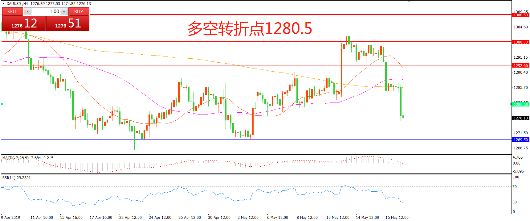 交易策略:在1280.50之下看跌,目标1269.50 1250.00