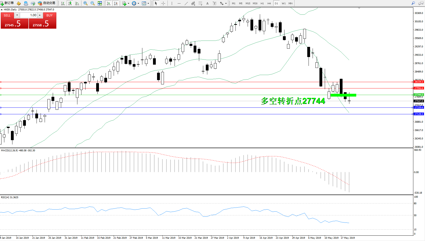 中国内地股市,截至收盘,上证综指跌1.23%,收于2905.97点;香港恒生指数冲高回落,截至收盘跌0.47%,报27657.24点。贸易战不断升温以及人民币贬值持续令市场承压,加上盘中A股重挫回调拖累港股倒跌,尾盘恒指跌幅加大。美国商务部宣布,将对华为的禁令延迟90天实施,直到8月中旬才会生效。现外围美股令港股承压,市场担忧两国贸易关系恶化给企业带来冲击,港股做多动力匮乏,因此,料港股短期震荡筑底。