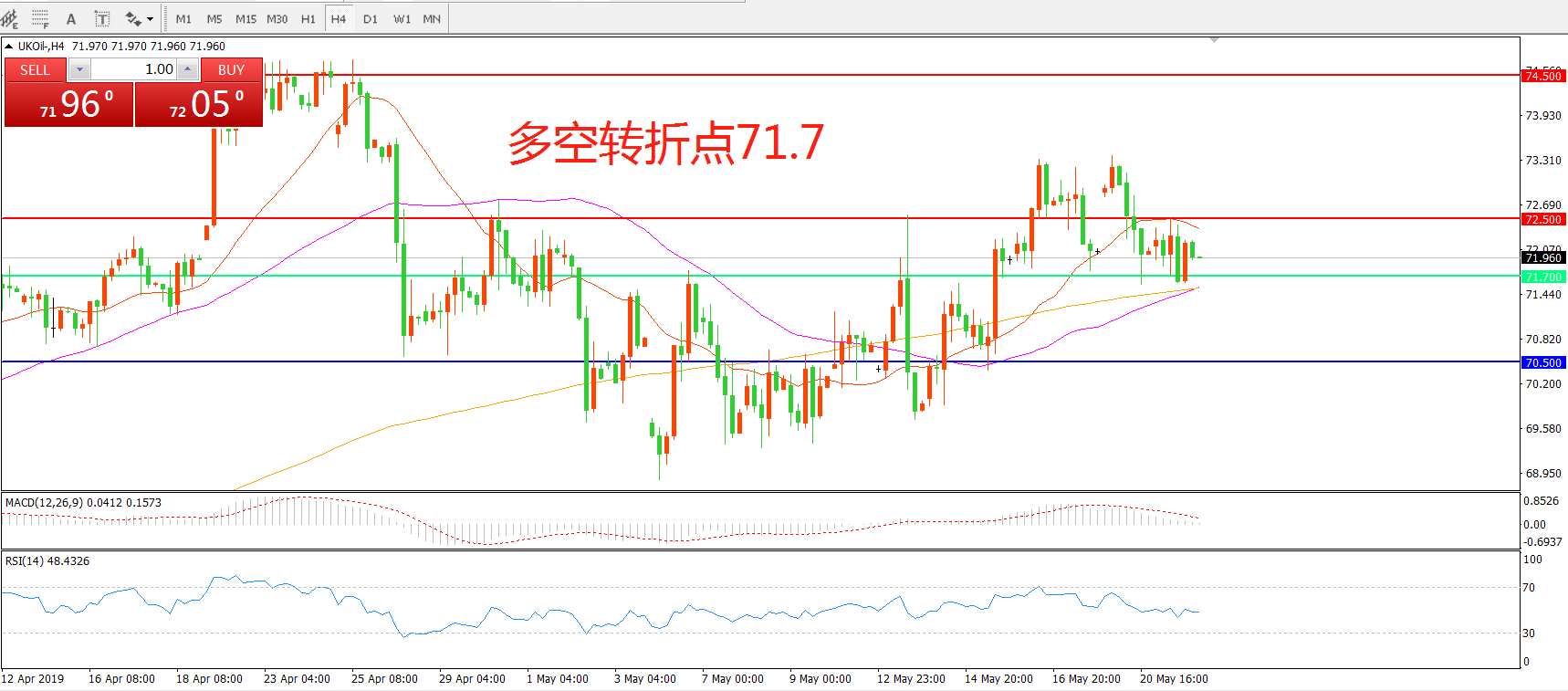 周二(5月21日),布伦特原油价格小幅下跌,收报71.96美元/桶。因OPEC+今年将继续维持减产,现在该组织考虑改到7月3-4日召开OPEC大会。美国石油协会(API)凌晨公布的数据显示,当周API原油库存意外增加240万桶,利空油价。晚间22:30将公布EIA库存数据,重点关注。同时美国与伊朗之间关系逐渐恶化,一旦爆发,有可能成为原油市场中的“定时炸弹”。