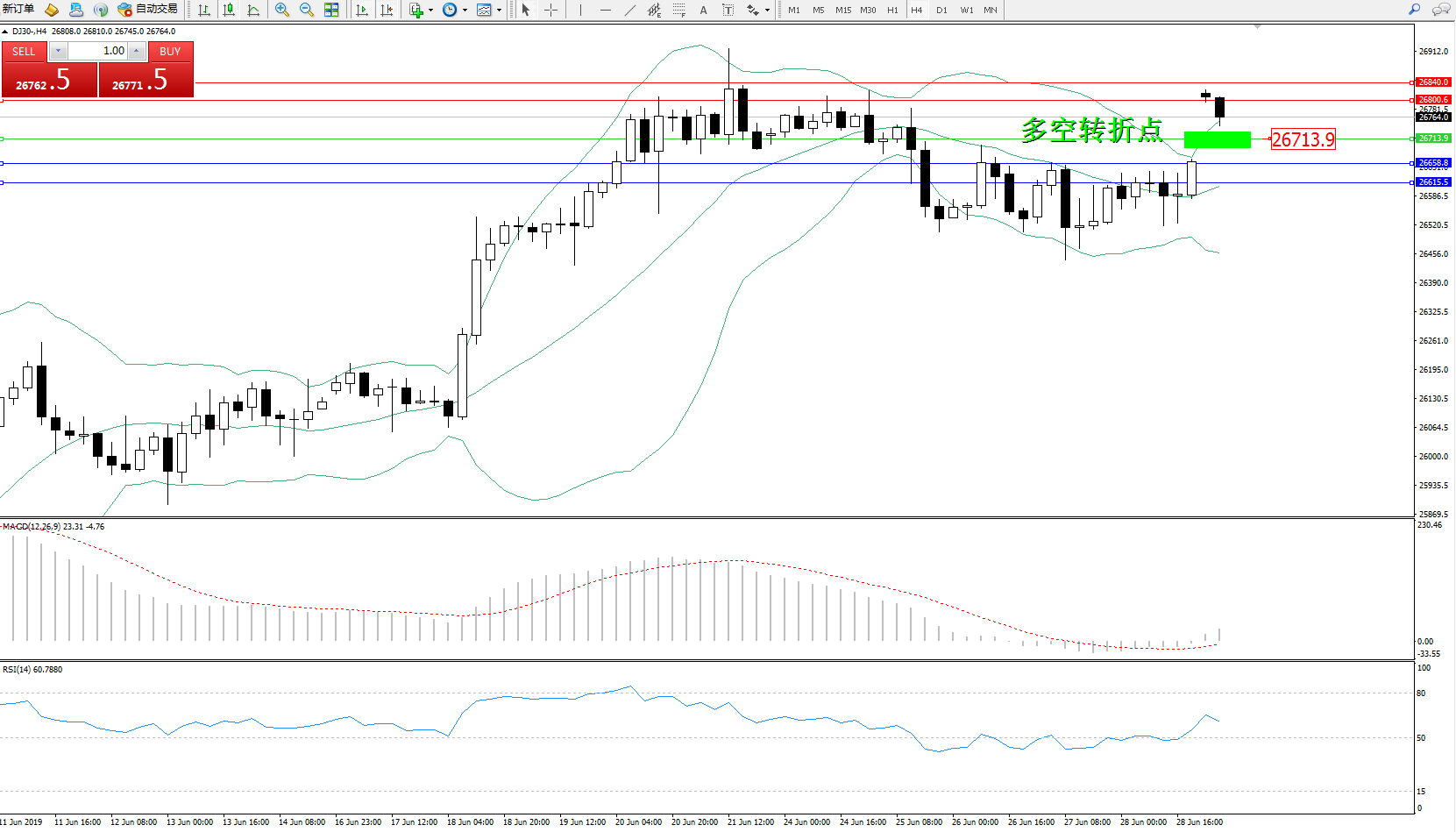 道琼斯指数DJ30—— 4小时K线图显示: