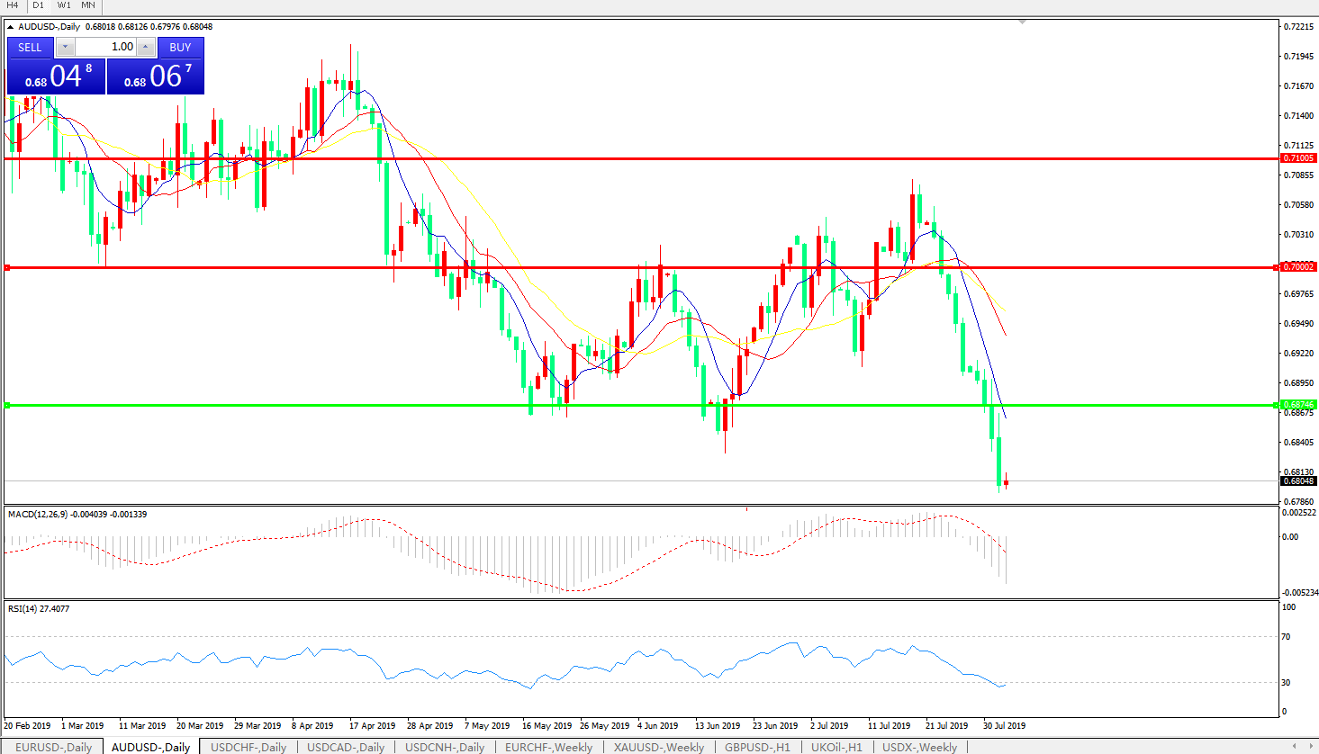 澳元兑美元在周四进入欧洲时段后再度下跌,汇价触及0.6828低位,创今年1月初以来近七个月新低,而若扣除1月3日汇市“闪避”的因素,则汇价基本已经处在2016年初以来的三年半低位;导致澳元持续承压的原因,除了美元指数受到美联储鹰派决议提振在日内继续走强外,还在于全球投资者风险偏好情绪依旧紧绷,并且美联储给宽松预期泼冷水的做法,对于大宗商品市场而言也是利空,这对于商品货币有着额外的压力,尤其是在全球贸易环境前景仍然存有疑云的背景下;同时,市场也开始提前瞩目澳洲联储下周的决议。在美联储打退堂鼓后,澳洲联储已经在本轮全球央行宽松竞赛中跑在了最前列,而面对外部艰困环境,澳洲联储仍不排除会暗示需要年内第三度降息,虽然下周不见得会立刻行动,但是光此预期已足以令汇价继续承压