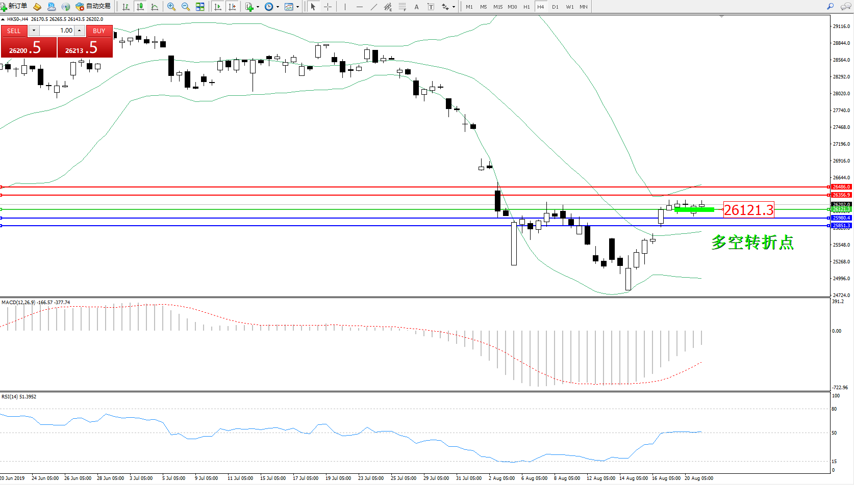 香港恒生指数821日(周三)收盘上涨38.50点,涨幅0.15%,报26270.04点;港股早上跟随低开71点后,再扩大跌幅,恒指低见26075,最多跌155点。以目前的估计计算,虽见便宜,但外围波动大,暂未见有好消息,仍有机会寻底。恒指现况将在26000点附近多空争夺,相信本月期结前或有望续反弹,特别是现时A股仍有望受惠内地政策消息层面及银根宽松度,从而拉动港股向上。本周五,美联储主席鲍威尔将在全球央行年会上发表讲话,此次讲话很可能会决定美联储接下来的计划,市场也是高度关注。