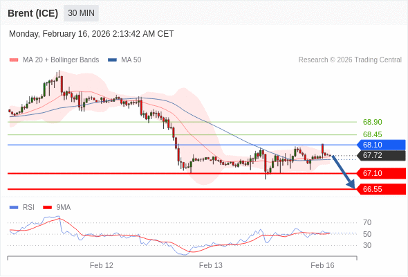 在 68.10 之下,看跌,目标价位为 67.10 ,然后为 66.55 。