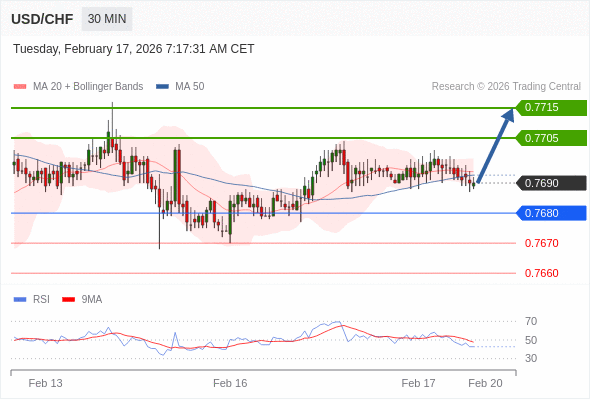 在 0.7680 之上,看涨,目标价位为 0.7705 ,然后为 0.7715 。