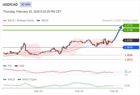 美元/加元 当日内 : 看涨,当 1.3669 为支撑位。