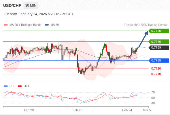 在 0.7735 之上,看涨,目标价位为 0.7770 ,然后为 0.7790 。