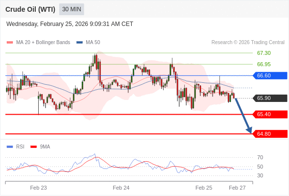 在 66.60 之下,看跌,目标价位为 65.40 ,然后为 64.80 。
