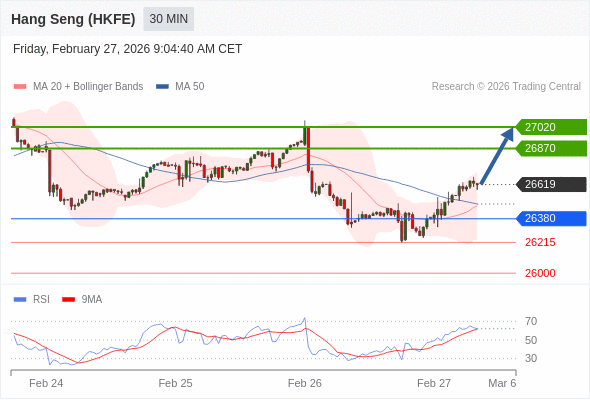 在 26380 之上,看涨,目标价位为 26870 ,然后为 27020 。