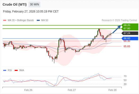在 66.60 之上,看涨,目标价位为 67.80 ,然后为 68.20 。