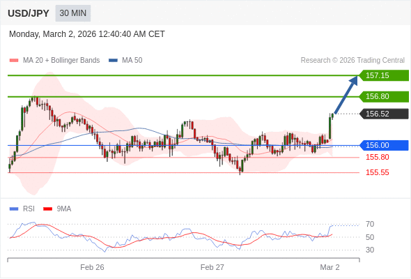 在 156.00 之上,看涨,目标价位为 156.80 ,然后为 157.15 。