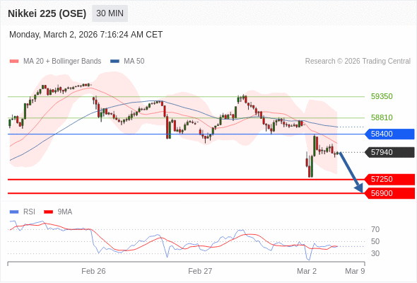 在 58400 之下,看跌,目标价位为 57250 ,然后为 56900 。