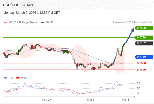在 0.7710 之上,看涨,目标价位为 0.7770 ,然后为 0.7800 。