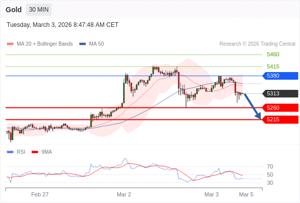 在 5380 之下,看跌,目标价位为 5260 ,然后为 5215 。
