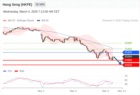 在 25300 之下,看跌,目标价位为 24880 ,然后为 24630 。