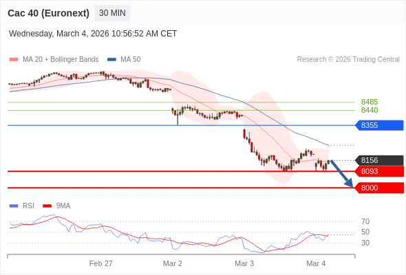 法国CAC指数期货 (Euronext) (H6) 当日内: 没有明显变化趋势。