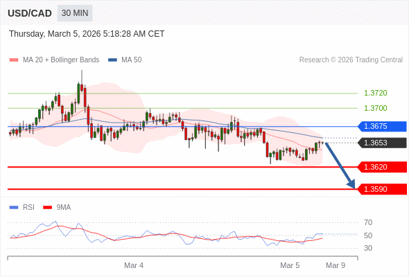 在 1.3675 之下,看跌,目标价位为 1.3620 ,然后为 1.3590 。