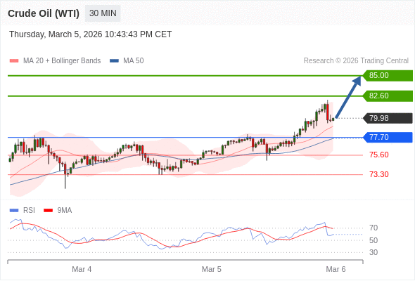 在 77.70 之上,看涨,目标价位为 82.60 ,然后为 85.00 。