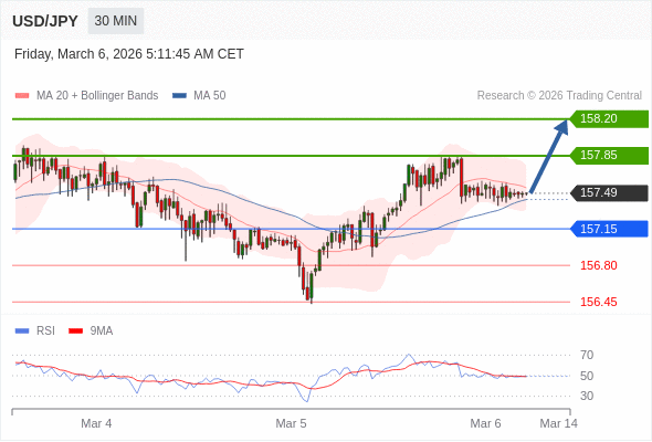 在 157.15 之上,看涨,目标价位为 157.85 ,然后为 158.20 。