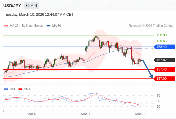 在 158.40 之下,看跌,目标价位为 157.40 ,然后为 157.00 。