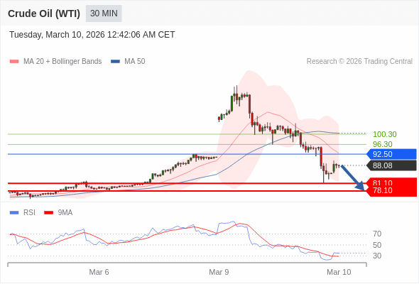 交易策略: 在 92.50 之下,看跌,目标价位为 81.10 ,然后为 78.10 。