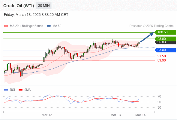 在 93.80 之上,看涨,目标价位为 98.00 ,然后为 100.50 。