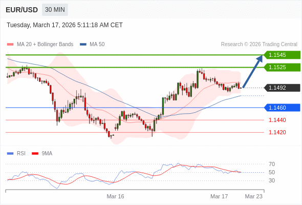 在 1.1460 之上,看涨,目标价位为 1.1525 ,然后为 1.1545 。