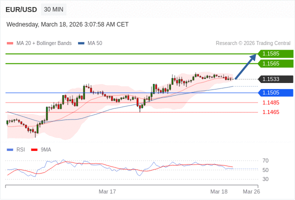 在 1.1505 之上,看涨,目标价位为 1.1565 ,然后为 1.1585 。