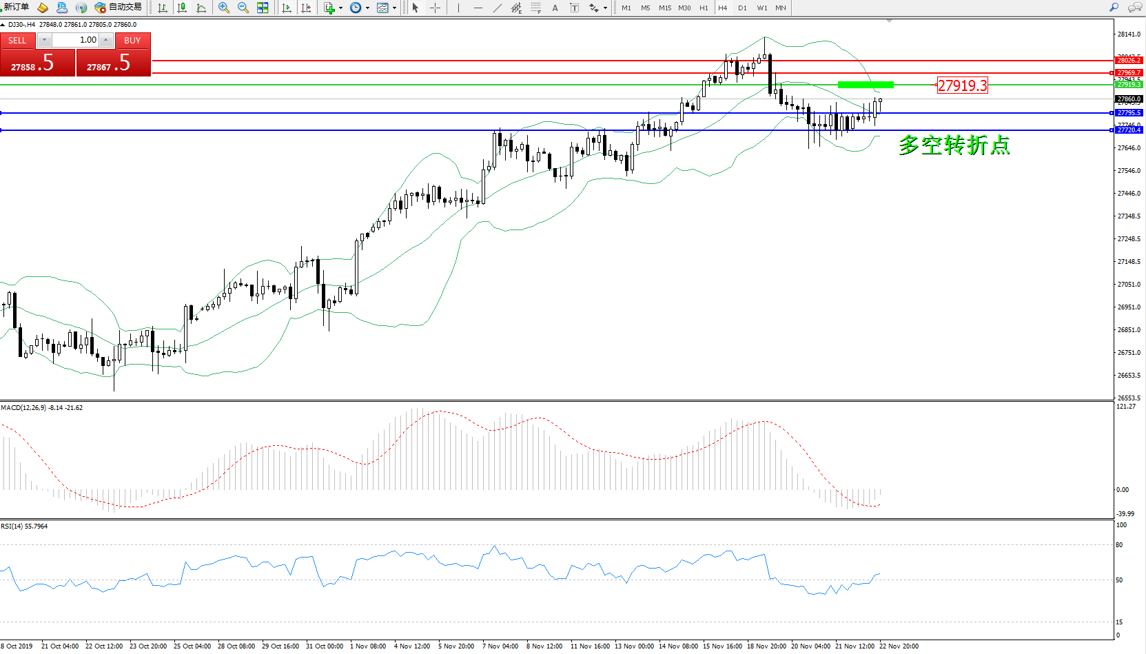 道琼斯指数DJ30—— 4小时K线图显示: