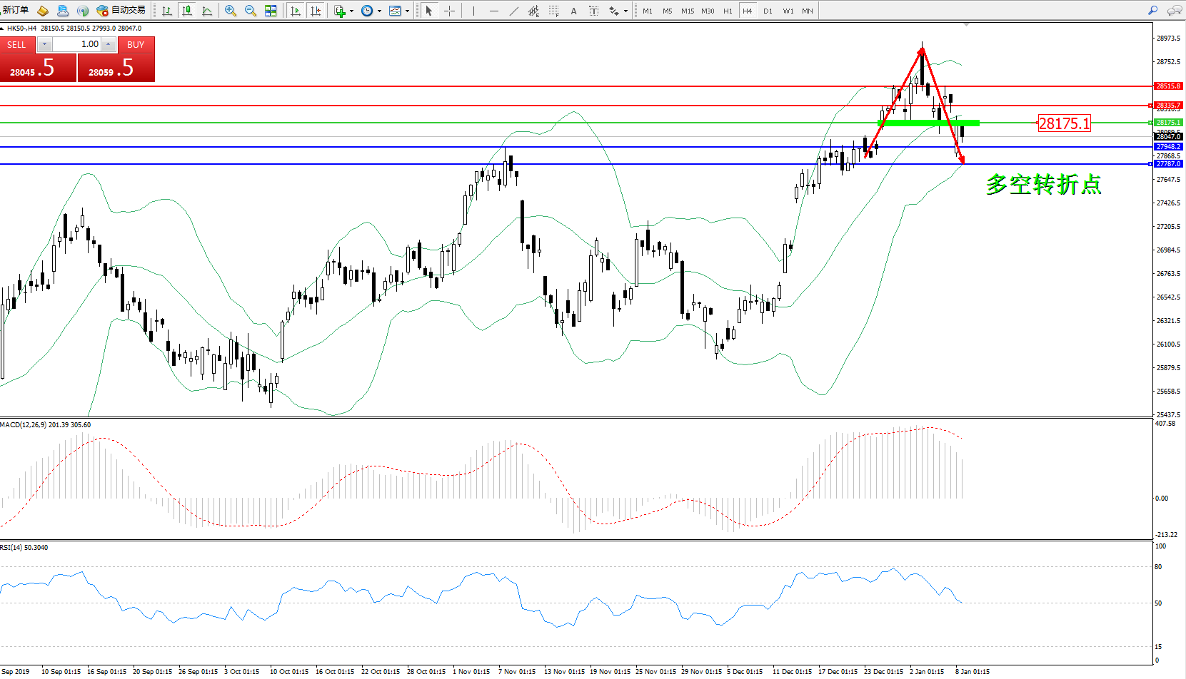 恒指HK50 ——4小时K线图显示: