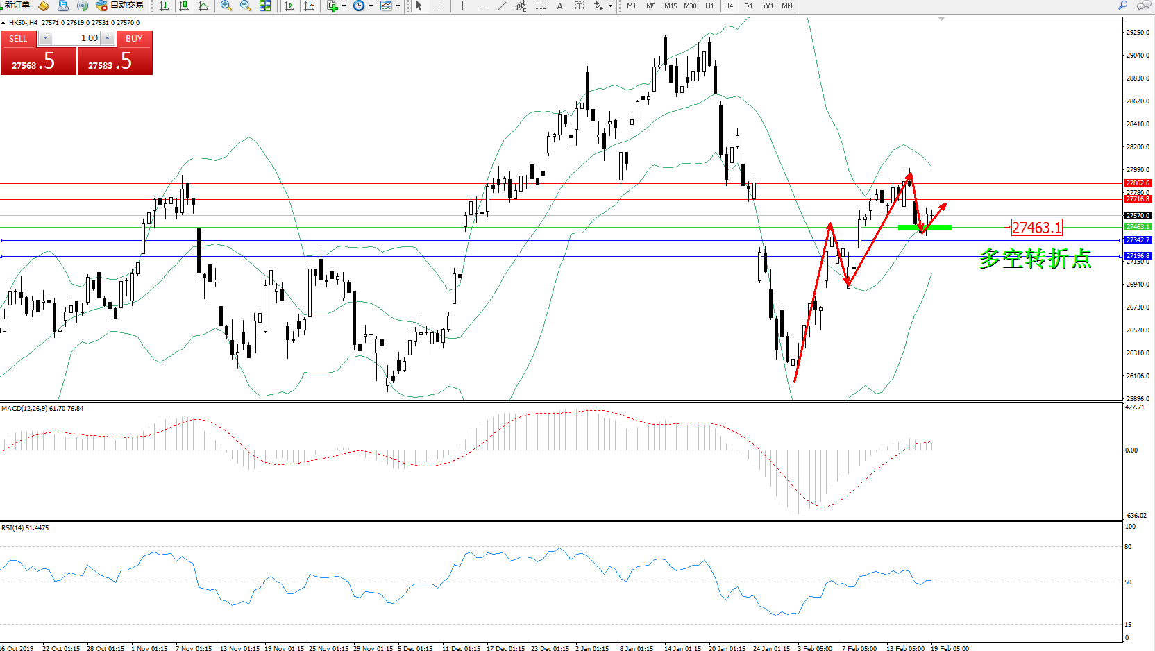 恒指HK50 ——4小时K线图显示: