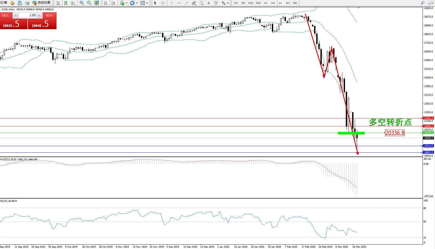 道琼斯指数318日(周三)收盘下跌1334.90点,跌幅6.29%,报19902.52点。美股今日再次暴跌,道指开跌约1200点,触发熔断,全市场暂停交易15分钟,恢复交易后道指继续下行,失守19000点,较2月高点跌超万点,但尾盘拉升,越来越多的迹象表明全球经济受到疫情的破坏,投资者对风险较高资产的兴趣依然疲弱;美元指数跳升至近三年高位,特朗普政府周三要求国会批准5000亿美元的拨款,用来派发给纳税人,46日起分两轮发放。