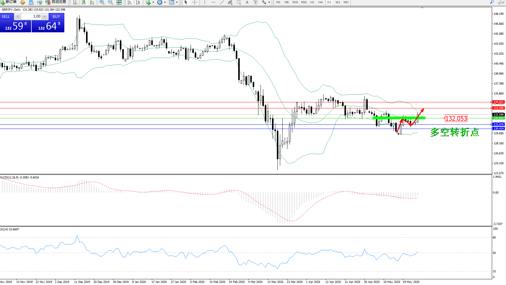 交易策略:132.053上方看涨,目标133.590134.521