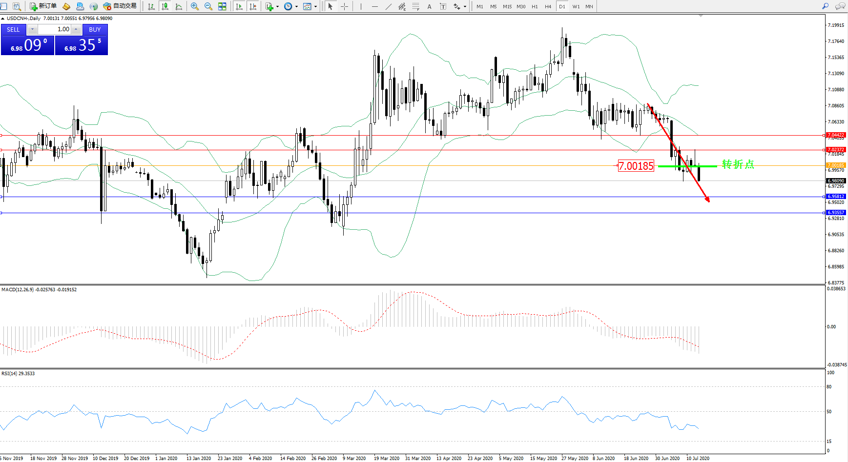 交易策略:7.00185下方看跌,目标6.95812、6.93557