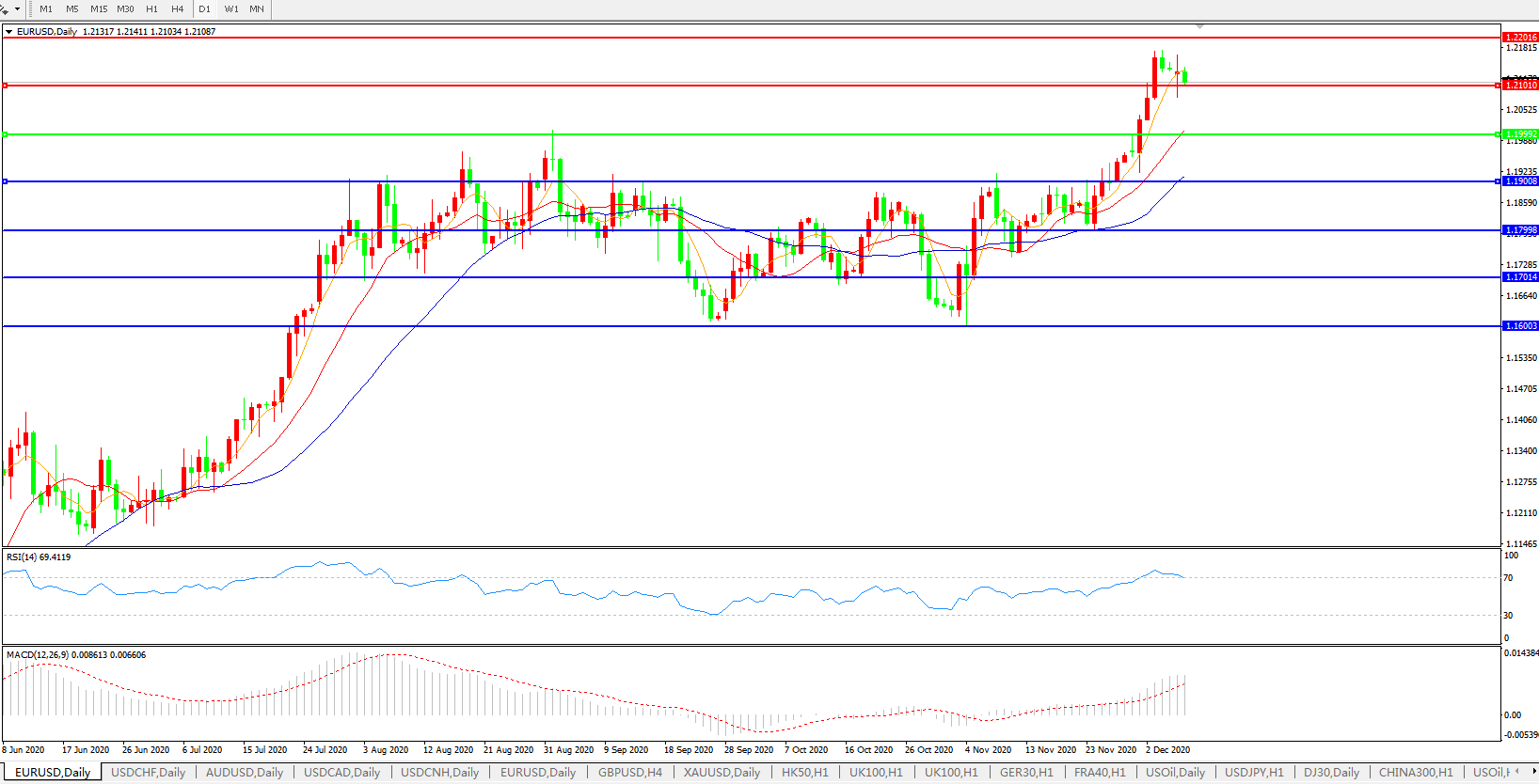 技术面简析:日图均线呈有序多头排列,汇价弱势小幅回落,MACD运行于0轴上方且量能0轴上持续放量 ,RSI超卖区域小幅走弱,预计短期汇价大概率将在整理后进一步上行。