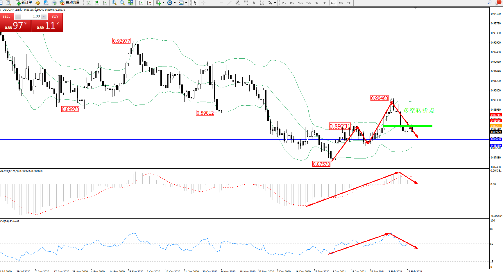 备选策略:0.89231上方看涨,目标0.89466、0.89715