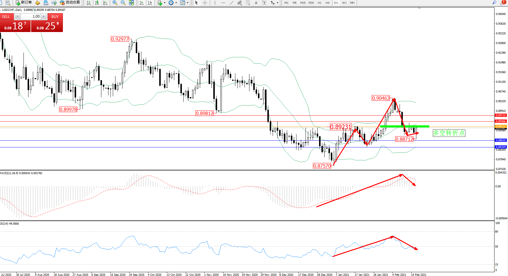 备选策略:0.89231上方看涨,目标0.89466、0.89715