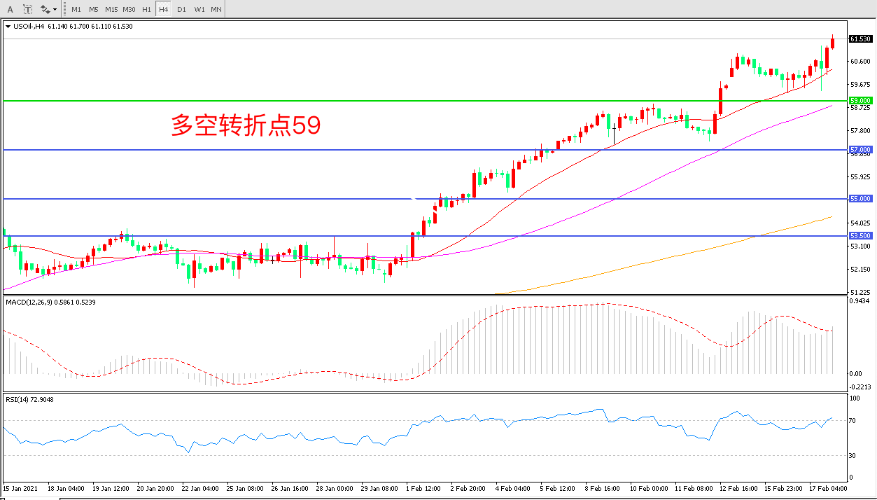 周四(2月18日)凌晨,根据美国石油协会公布的数据显示,当周API原油库存大幅减少580万桶,好于市场预期减数据公布后,美油短线攀升,收报61.72美元/桶,涨幅扩大至2.78%。受假期因素影响EIA数据将于周五凌晨0:00公布如果该数据与API表现一致无异于火上浇油油价将迎来更大幅度的上涨