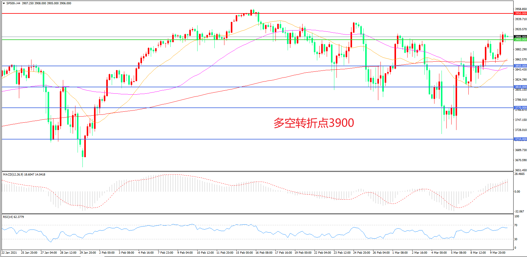4小时图看,标普500长阳拉升,短期走势有所回暖,均线系统走平形成下方支撑,3900成为多空分水岭    ,    MACD红柱增加,RSI指标走平,日内震荡上行概率较大。