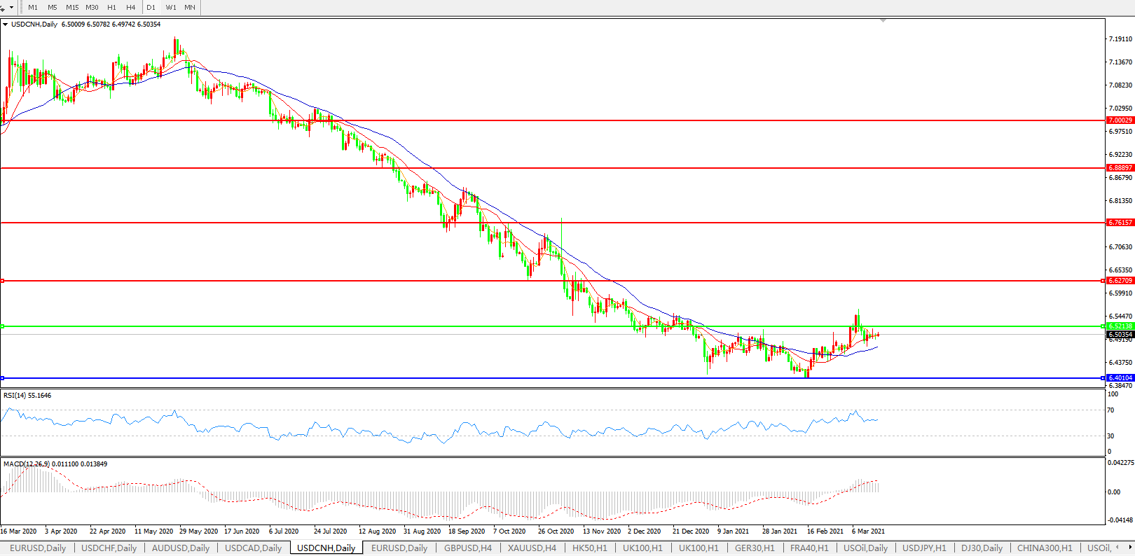 美元兑人民币USDCNH 日线图: