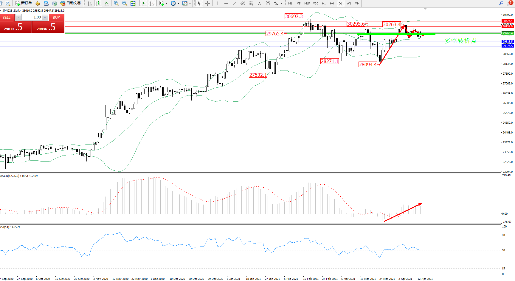 日经225指数4月13日(周二)收盘上涨228.27点,涨幅0.77%,报29767.00点。由于疫苗刺激经济增长和通货膨胀,美国率先大力推进疫苗注射之举,令投资者押注美联储会比预期更早收紧货币政策,此状况带动了美债收益率反弹,同时也推动美元指数走强;相比起美联储,日本央行事实上在进一步宽松政策行动上已经力不从心。日本本身汇价相比公允水平已经低估的状况,则更将强化这一趋势。日本央行行长黑田东彦称:日本央行将继续保持宽松政策。日本央行3月的评估使得宽松政策更加灵活和可持续。日本央行将通过收益率曲线控制(YCC)在很长一段时间内继续维持宽松的货币政策。个人认为日本可以在结构改革方面做得更好。