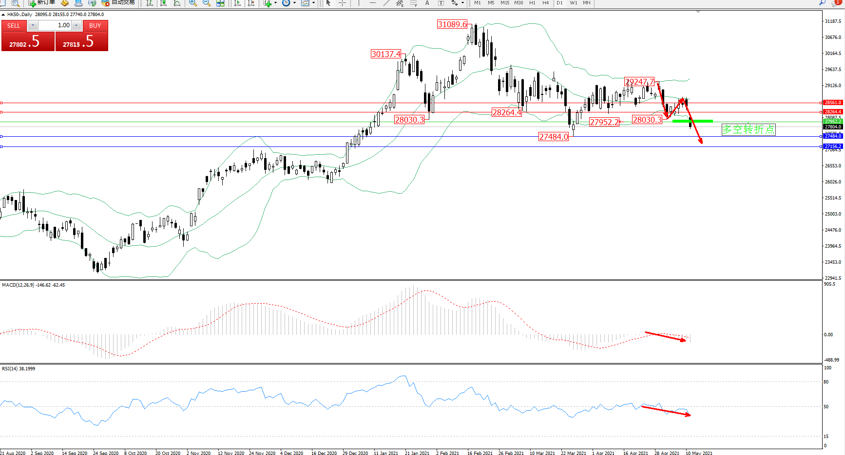 交易策略:27952下方看跌,目标27484、27156