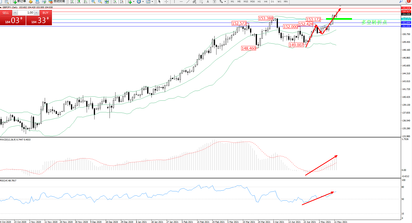 交易策略:153.172上方看涨,目标154.417、155.028