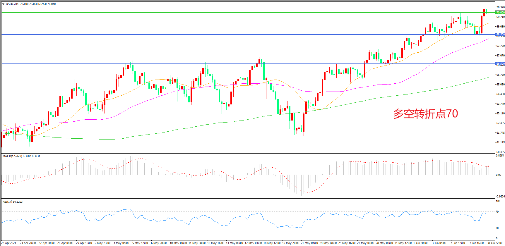 支撑位:70.50 68.50