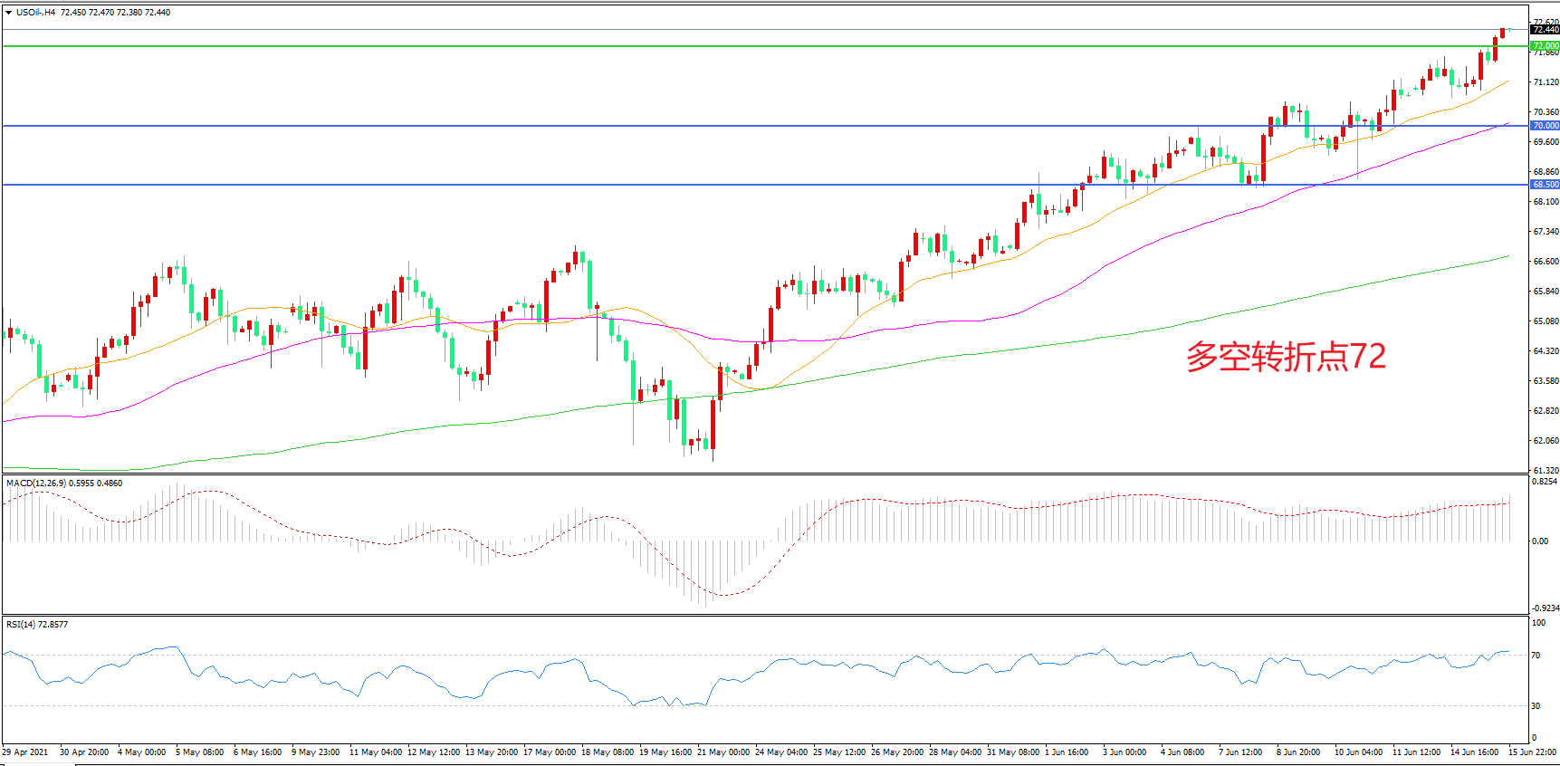4小时图看,油价连续拉升,多头趋势十分明显,72美元成为短期多空分水岭,MACD红柱增加,均线系统呈多头排列,日内延续上行概率较大。