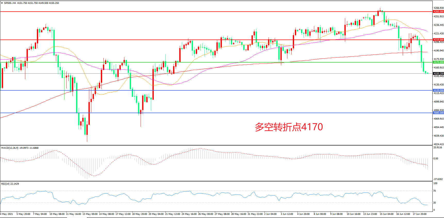 上周五 (6月18日),原本一直被认为是最鸽派的美联储官员——圣路易斯联储行长布拉德,忽然发表了重磅鹰派言论,预计美联储最快将在2022年末首次升息,美股闻讯暴跌,标普500大幅下挫,收报4151点。布拉德的发言证实目前已经就缩债进行讨论,此番言论进一步印证了美联储的鹰派论调,市场风向的转变将导致美股出现更进一步的下行。